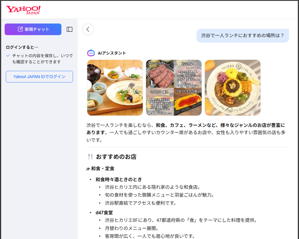 ▲AIアシスタント「渋谷で一人ランチにおすすめの場所は?」